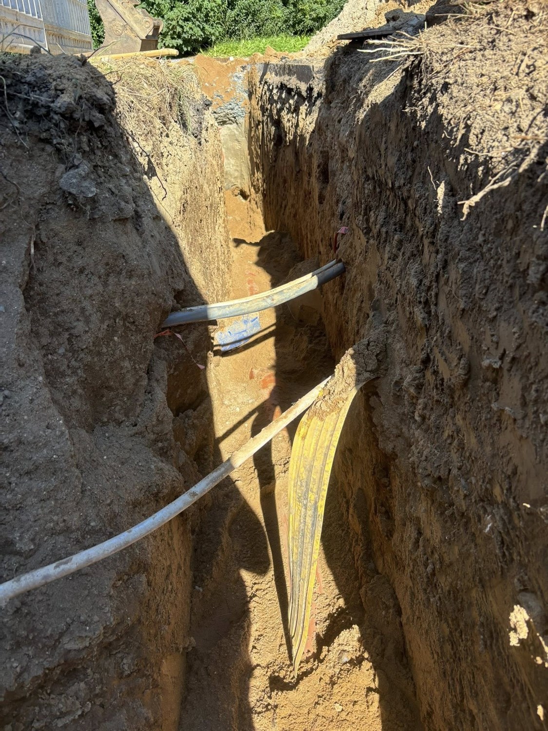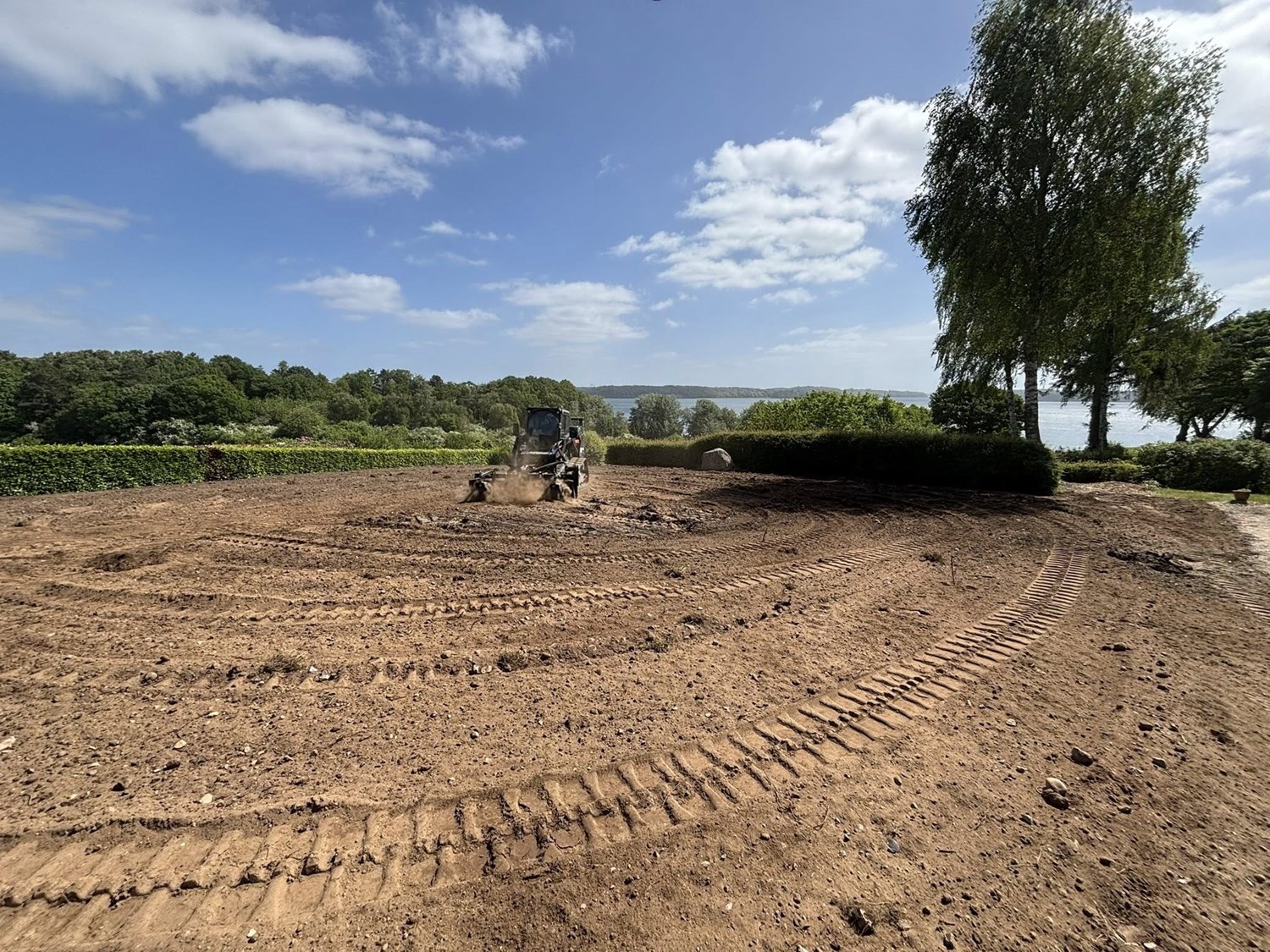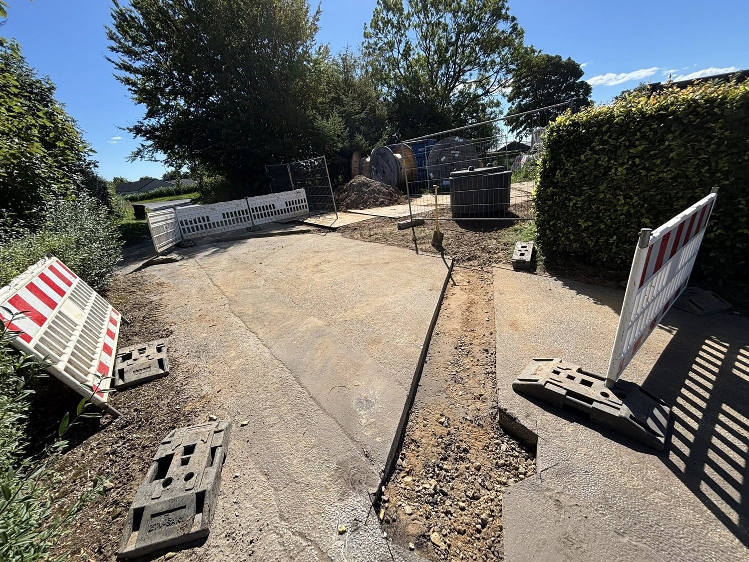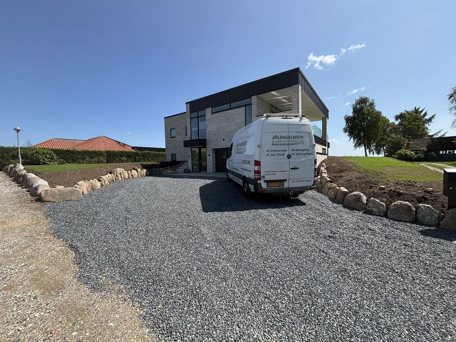 Afretning af stabilgrus til smukbeton, sætning af 10 meter afvandingsrende